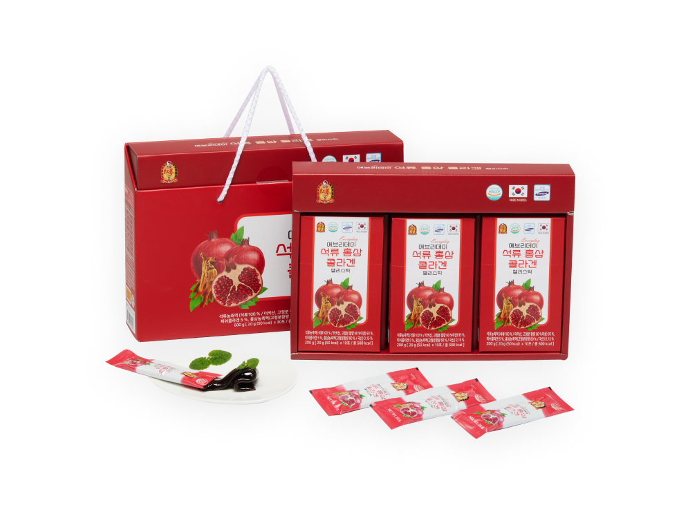 에스트로겐이 가득한 석류와 피부에 꼭 필요한 콜라겐에 홍삼농축액까지 들어있는 건강 간식